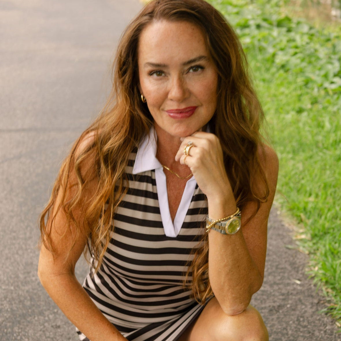 The EG Classic racer back tank is the newest addition to our exclusive collection! Featuring a built in bra with removable pads, V neckline with collar, and the perfect length to wear tucked or untucked! Runs tts. 85/15 poly/spandex blend