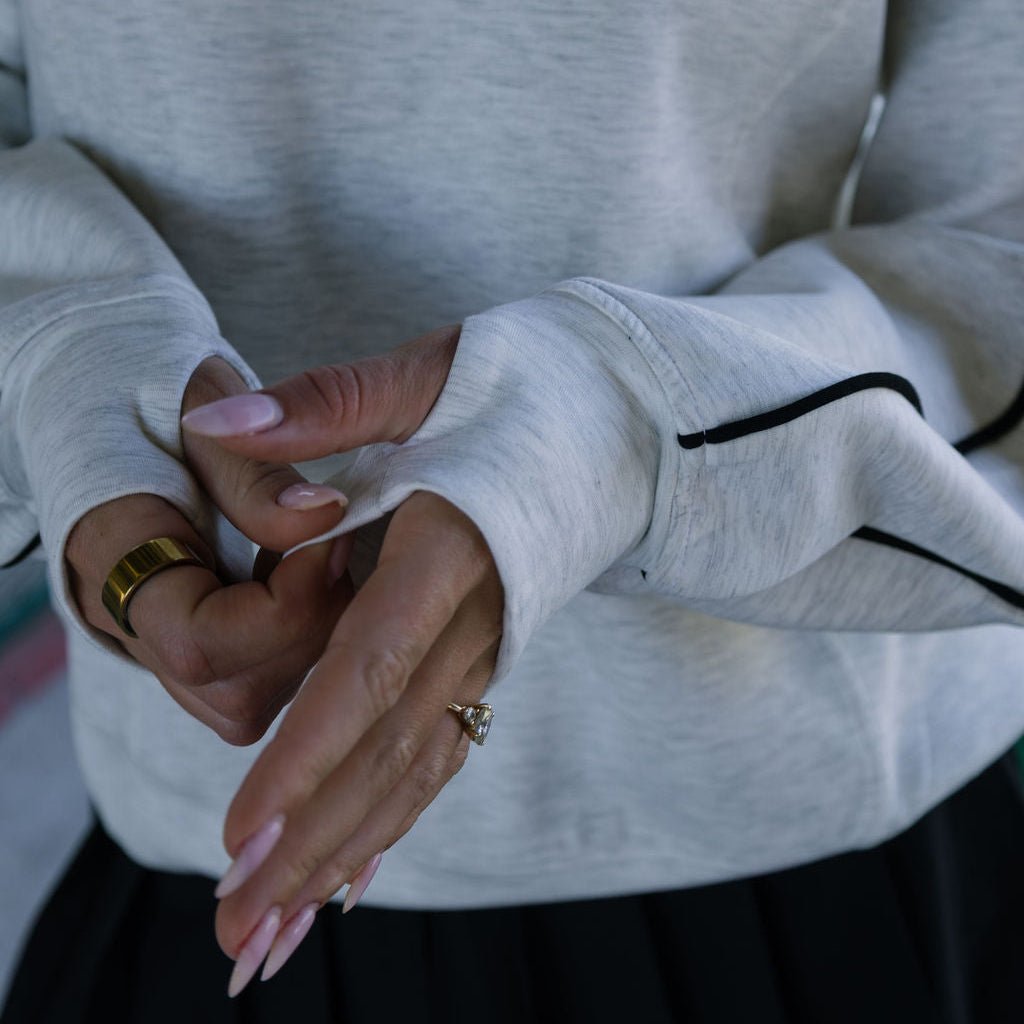 Our new scuba light fabric in a mock neck sweatshirt. Featuring double stripe piping detail down the sleeve and a thumbhole for those cooler temps! A piece that is a closet staple and so versatile for whatever the day (or a cozy evening) holds! Runs tts